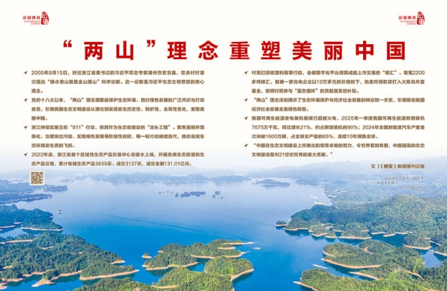 作为习生态文明思想的核心理念,“两山”理念给出了中国方案。它不仅深刻重塑了中国经济社会全面发展的路径,更超越了地域和时代局限,为全球可持续发展贡献东方智慧。