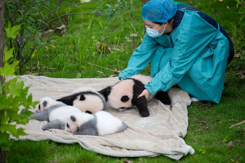 9月6日,成都大熊猫繁育研究基地,今年出生的熊猫幼崽在饲养员精心照料下公开亮相。