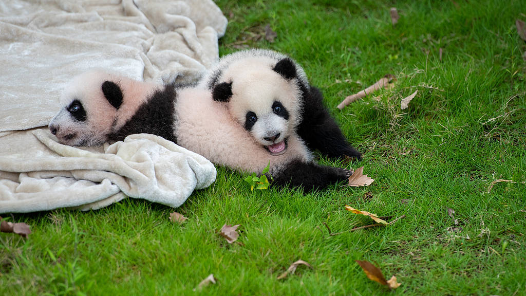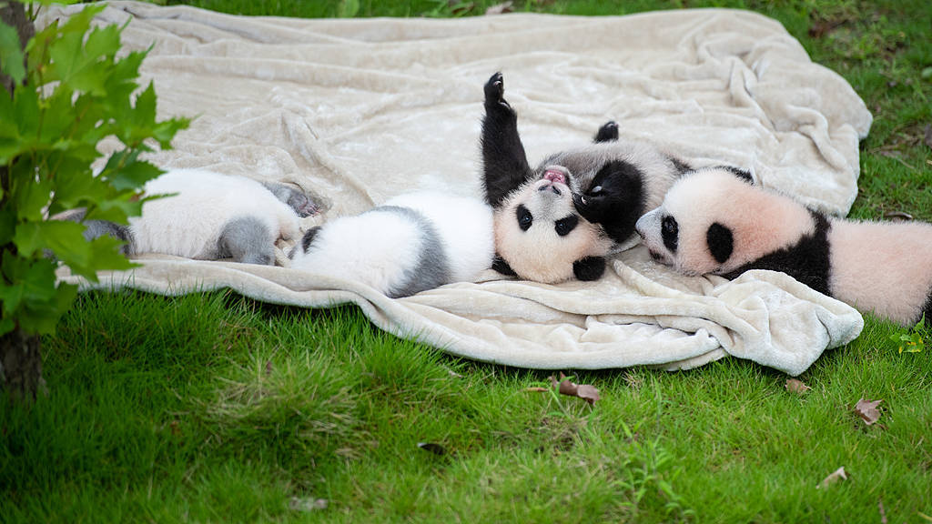饲养员们温柔地怀抱毛茸茸的熊猫宝宝,轻轻将它们放置在铺好软垫的场地上。这些萌态可掬的幼崽们伸着懒腰,慵懒地享受着秋日温暖的阳光,展现出各种可爱姿态。