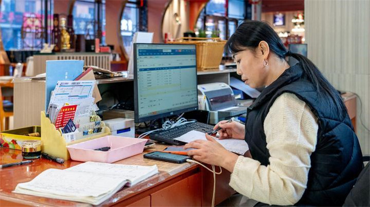 吉林省白山市抚松县的一家人参美肤品店内,店长周声荣正在处理线上订单。唐成卓 摄
