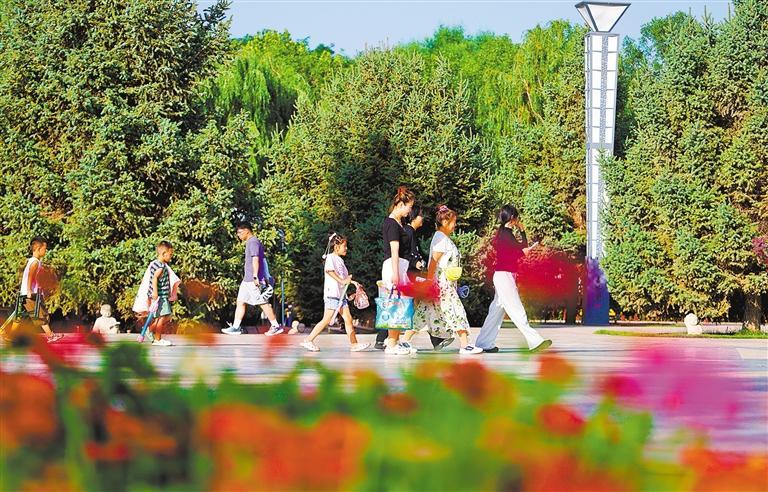 7月27日,市民在甘肃嘉峪关东湖生态旅游景区休憩游玩。经过多年建设,这里已从昔日荒地蜕变为生态绿地。