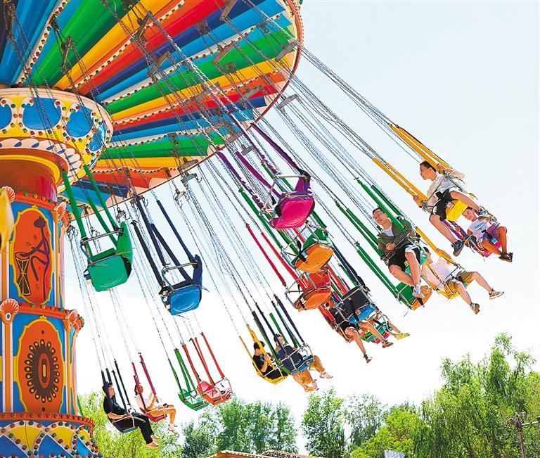 7月27日,游客在甘肃嘉峪关方特丝路神画主题乐园体验户外项目,这是国内首座创新展现丝绸之路历史文化的大型高科技主题乐园。