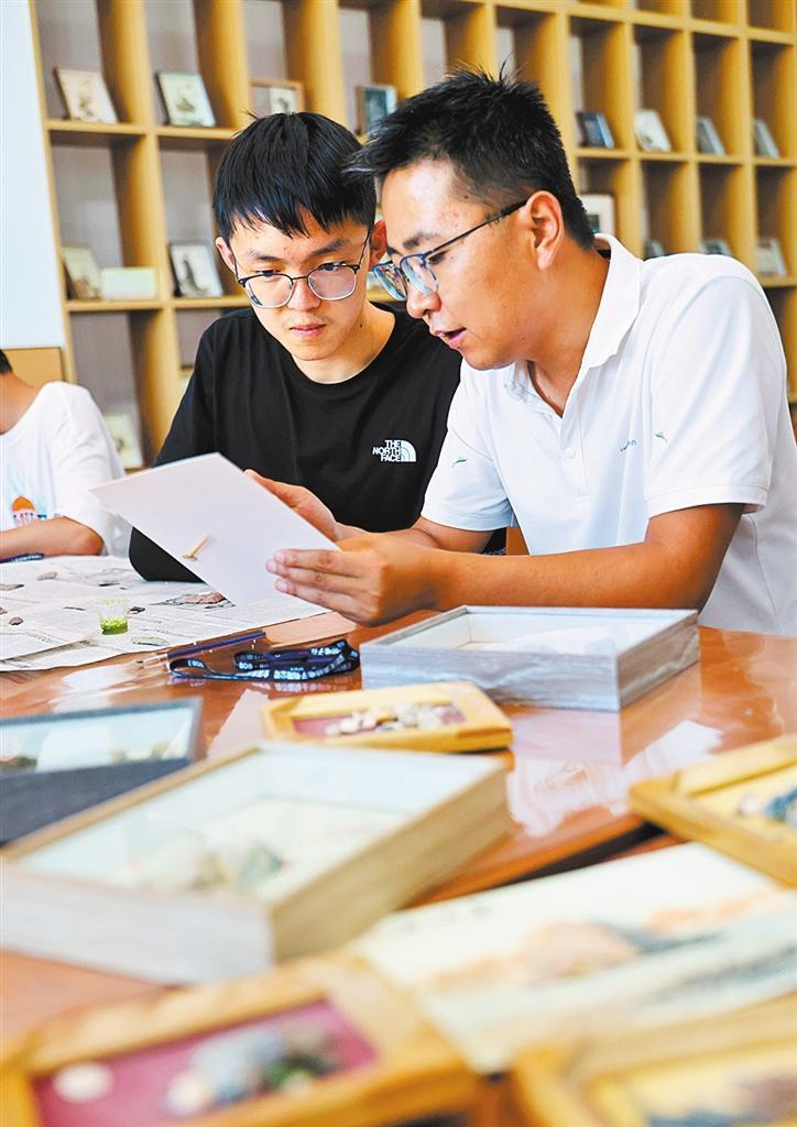 7月27日,甘肃嘉峪关一处非遗展示基地,研学团体正在体验非遗石艺画制作。当地非遗研学基地依托独特的地域文化,吸引了众多游客前来体验非遗、感受传统技艺。