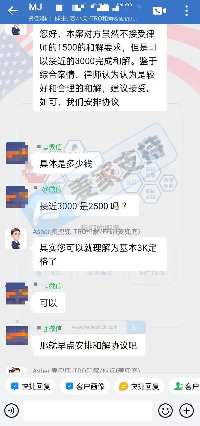 在得到客户的授权后,特级律师团队即刻行动,迅速与原告律所建立联系,并在较短的时间内取得了侵权证据。麦家支持的特级律师团队凭借对此类TRO案件的丰富经验和,首先对案情进行了细致的分析,并据此制定谈判策略。经过几轮高效谈判,律师团队最终为客户争取到了3000美元的和解成果,成功挽回了客户高达1.4万美元的直接经济损失。且最终的和解成本仅占冻结资金的17.6%,充分展现了特级律师团队的专业水准和高效服务。